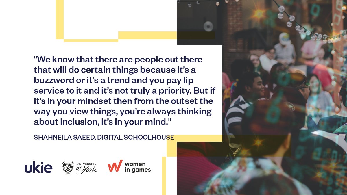 “Being able to take part in this project has been incredible. Now more than ever before it is vital to bring novel, collaborative ideas and perspectives to the ever-changing status of the video games industry. Only by engaging with the vast multiplicity of voices within our industry can we nurture a welcoming, supportive environment of creativity and growth. Reports like this, with a practical outcome, I hope will serve to help many people in the future and in the many events that will come."