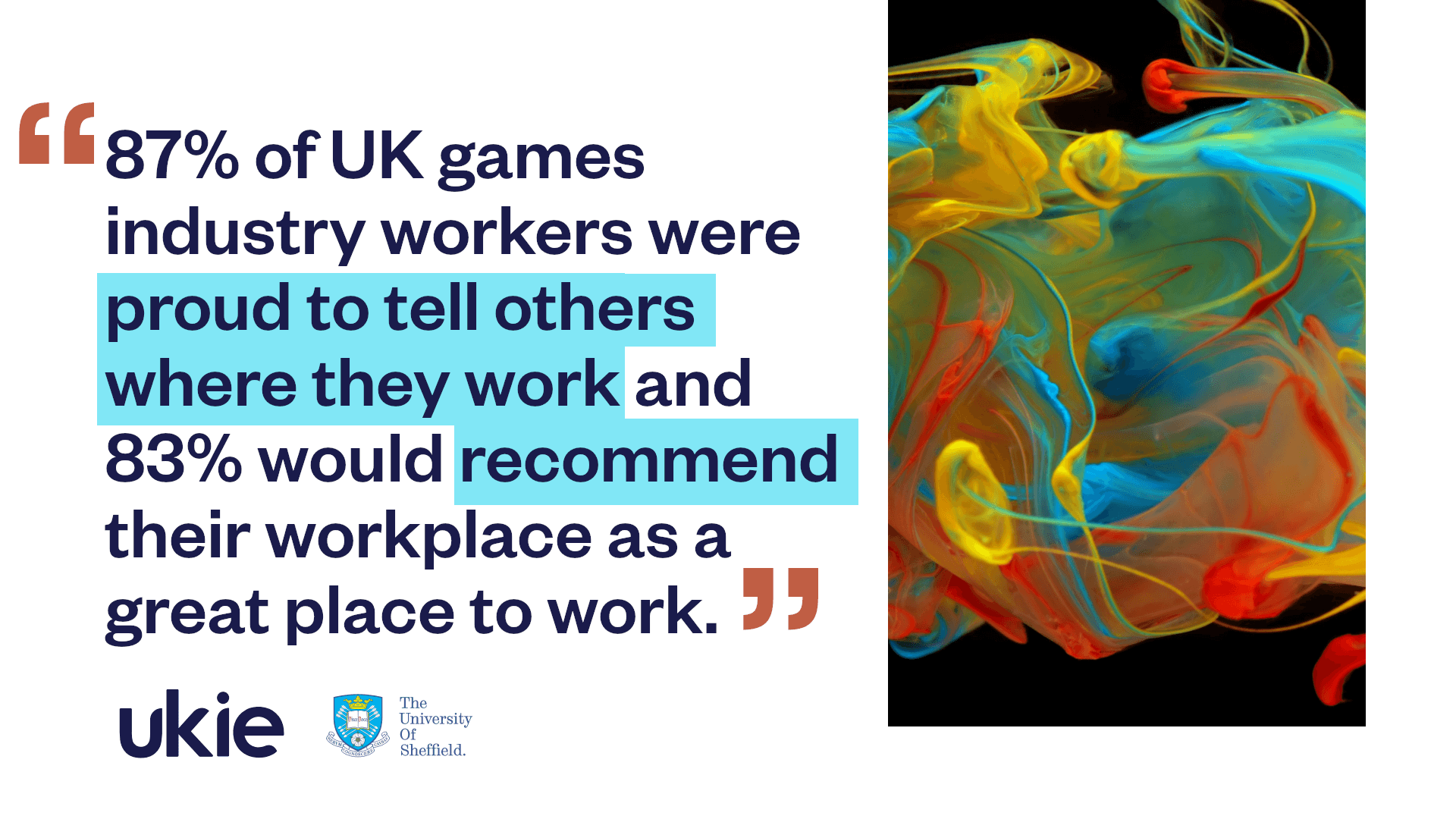 Overall, attitudes to both individual workplaces and the industry at large tend to be positive. The vast majority of people who work in the sector feel proud to do so with 87% of people being proud to tell others where they work specifically and 85% proud to be a part of the UK games industry.