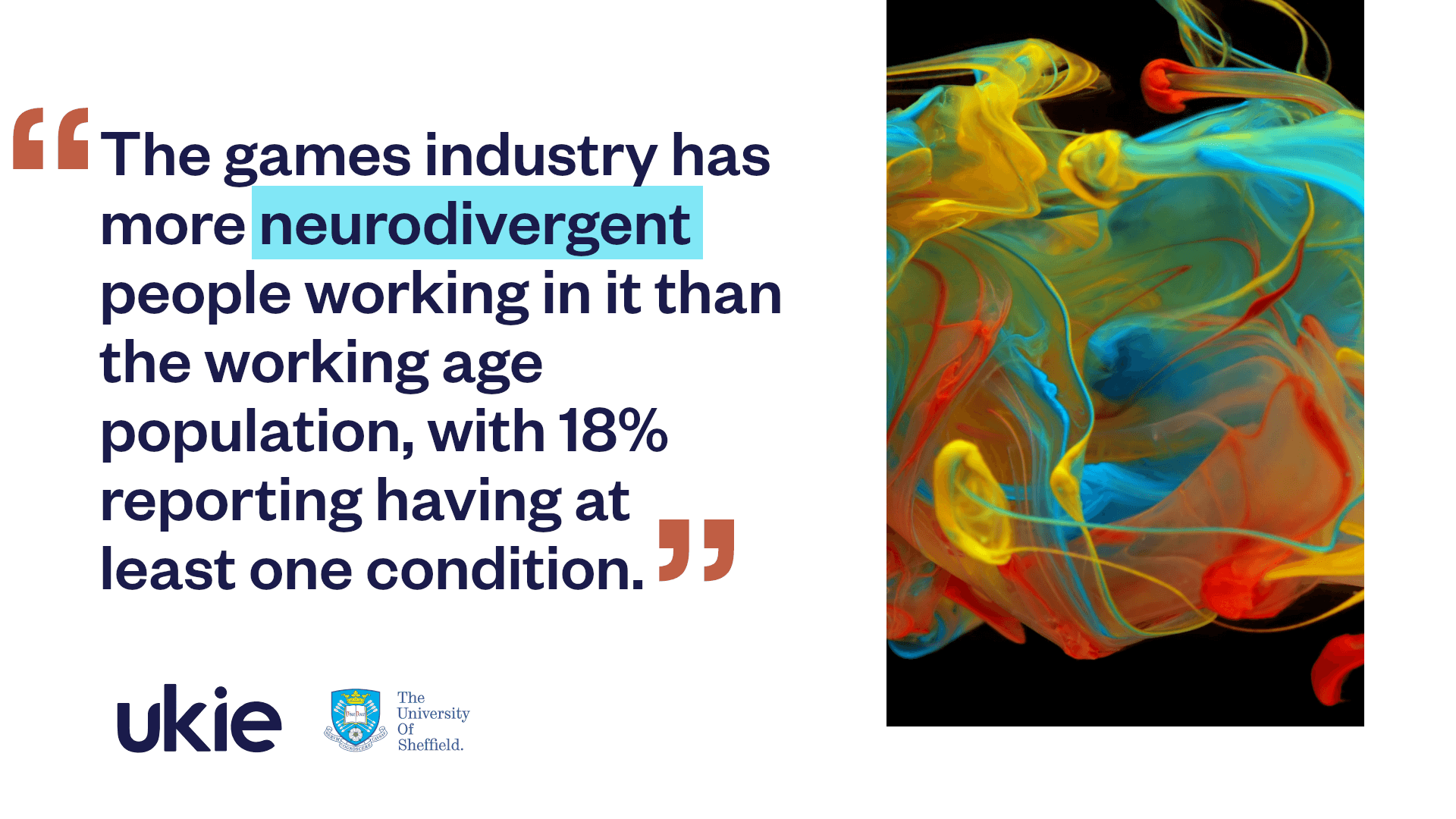 The games industry has more neurodivergent people working within it than the working age population. Overall, 18% of respondents reported having at least one neurodevelopmental condition. More people in games were autistic or had a condition affecting concentration, such as ADHD, than the working age population.
